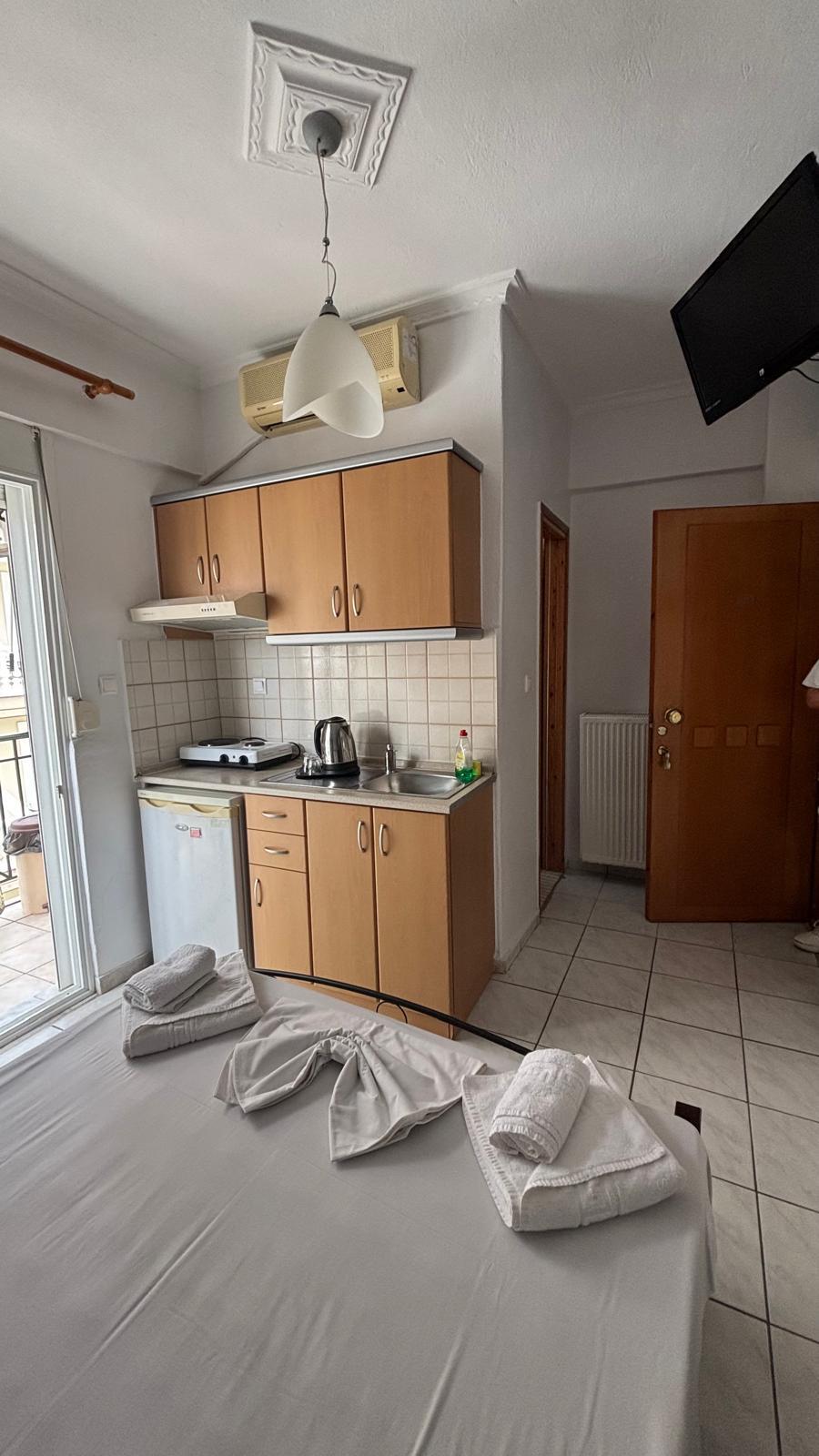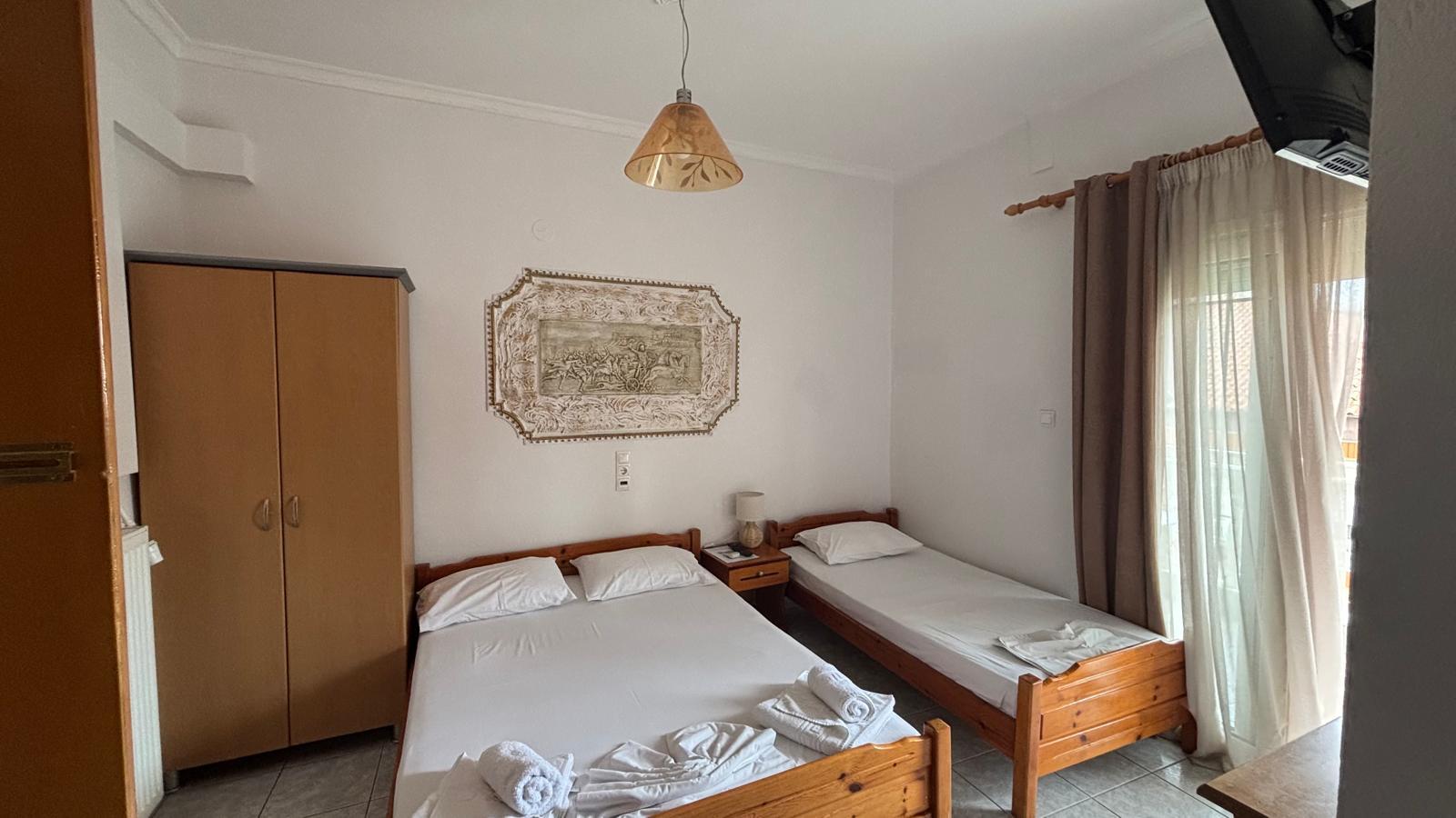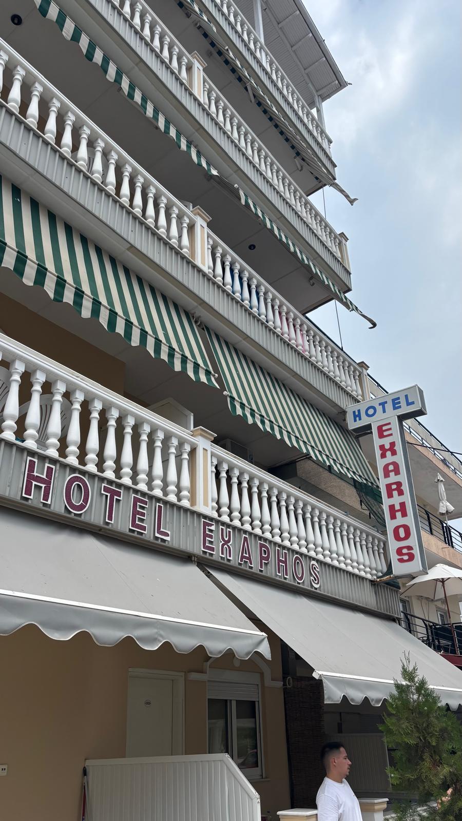 Vila EXARHOS este situată în stațiunea Paralia Katerini, la o distanța de aproximativ 150 m față de mare. Vila dispune de lift, internet Wi-Fi, camere duble, triple și studiouri de 4 persoane(toate cele 4 persoane in aceeași cameră). Camerele și studiourile sunt dotate cu chicinetă(pe un perete al camerei) complet echipată, frigider, balcon, televizor, aparat de aer condiționat, dulap pentru haine, baie cu duș.