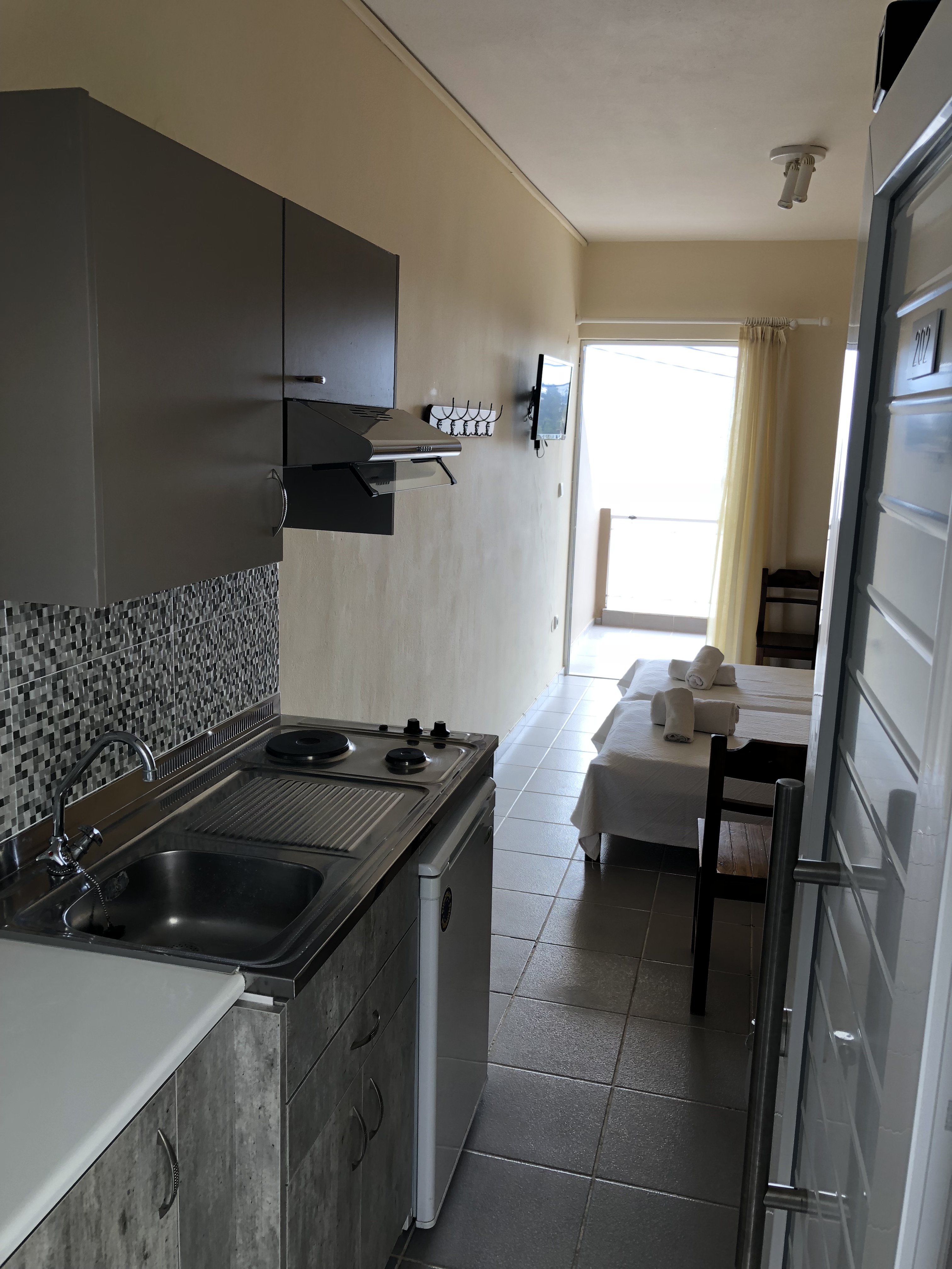 Camere: vila dispune de camere duble (cu posibilitate de pat suplimentar), toate dotate cu aparat de aer condiționat (folosirea aparatului de aer condiționat nu este inclusă în costul pachetului, se plătește la fața locului), TV, frigider, chicineta complet echipată (pe un perete al camerei), baie cu duș, balcon, internet Wi Fi. Toate camerele dispun de vedere la mare.